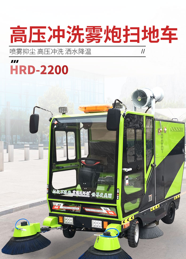 HRD-2200高壓清洗霧炮四輪掃地車及清掃、灑水、噴霧、清洗為一體,清掃寬度可達2300mm,可連續工作6-8個小時,灰塵 石子 落葉 煙頭煙灰 木屑 瓜果等一掃而凈,特別適合煤礦、水泥廠、雕刻廠、面粉廠、建材廠、金屬冶煉廠、工廠車間、商場、車站、學校、機場外圍、廣場公園、景區等場所使用。