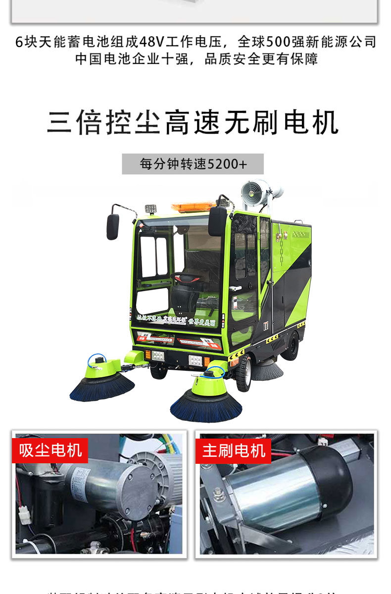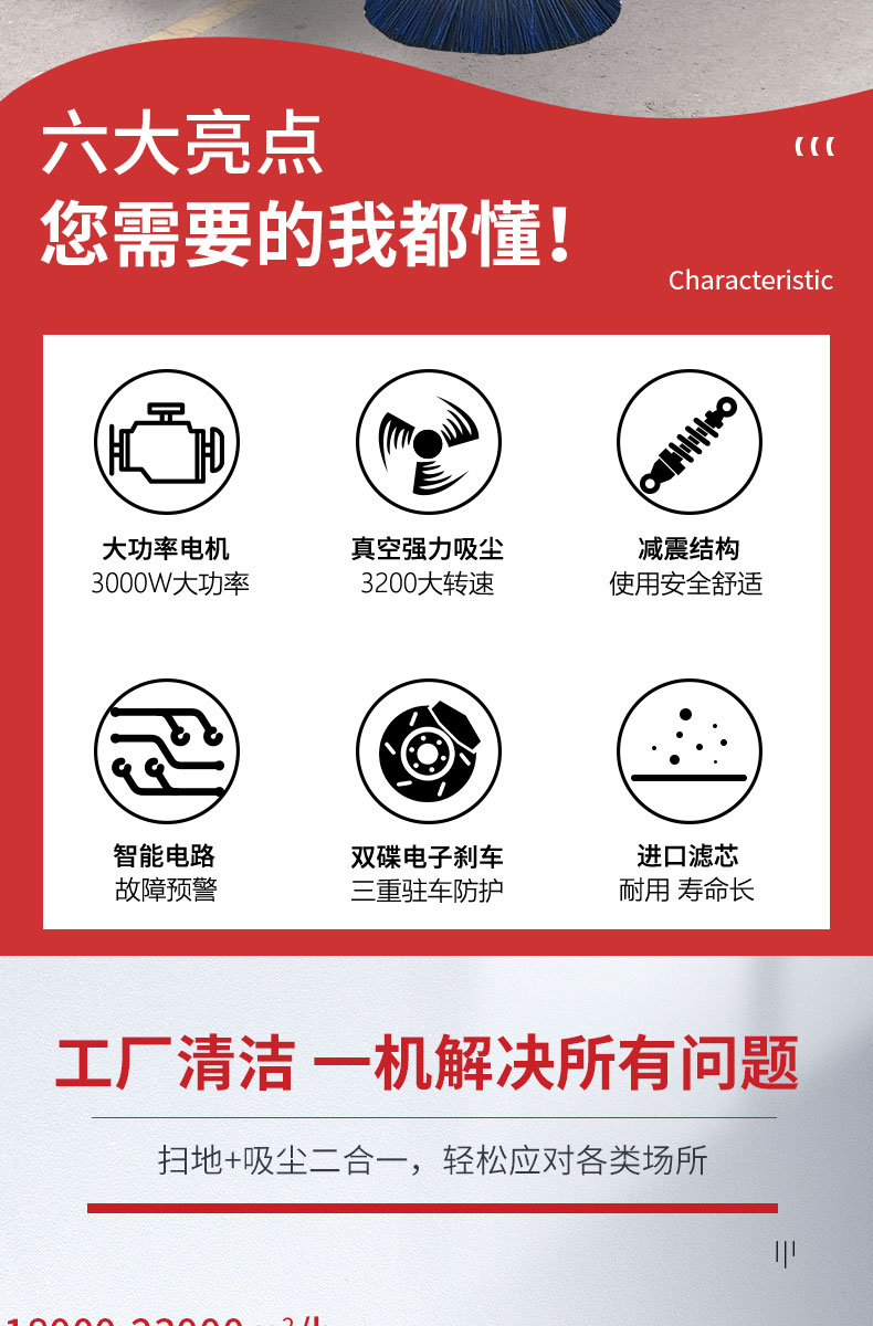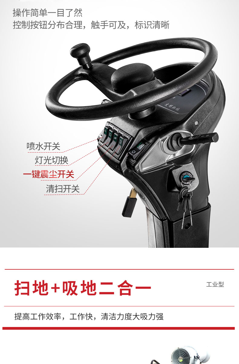 - 產品特點: ●內置強大控塵系統,雙吸塵風機,吸塵能力更強,掃地寬度可達2000mm。 ●過濾系統采用雙桶式濾芯,保養維護更方便,過濾面積更大。